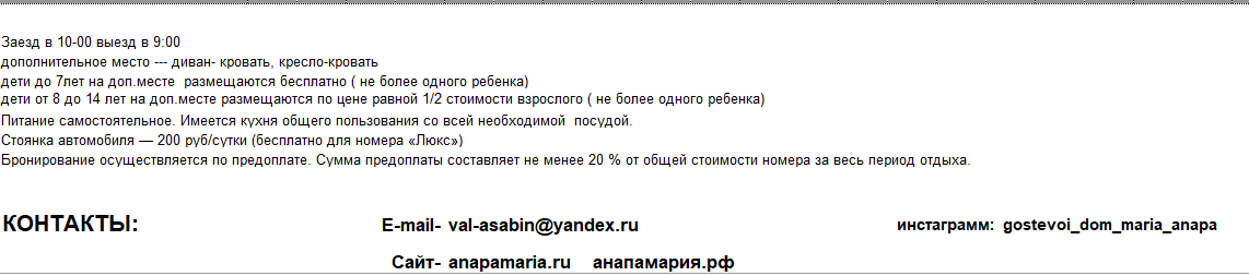 Мы позвоним вам и обговорим все условия, подберем даты заезда, проконсультируем по номерному фонду, расскажем о местоположении гостевого дома, удобствах, а кроме того обязательно подарим вам хороший путеводитель по г. Анапе. Дадим скидку и расскажем, как лучше провести отдых и сколько денег взять с собой. Подробно проконсультируем о местах развлечений в Анапе.